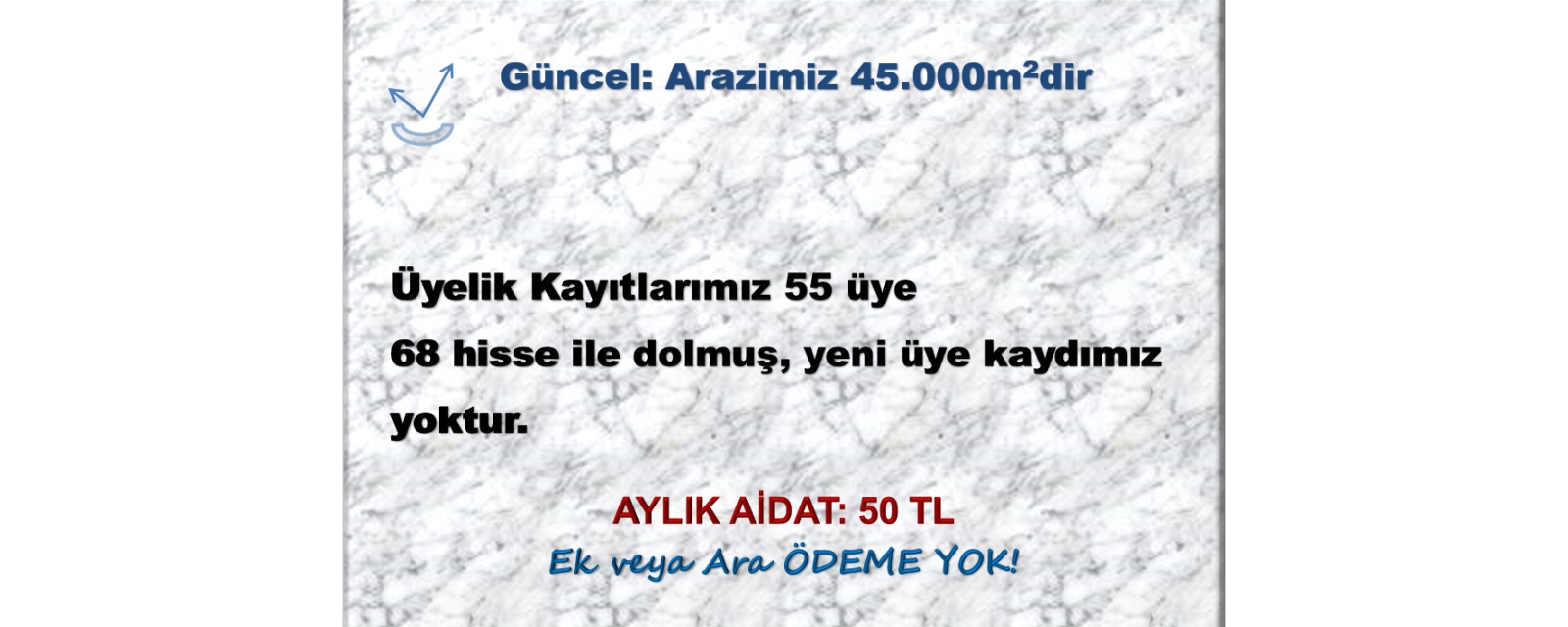 Arsa Katılım Payı olarak (aylık aidattan hariç bir meblağ ödemeden) yatırımda bulunarak hedeflediğimiz 35.000 m